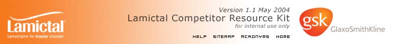 This multicomponent toolkit has been developed to facilitate the commercialization of Lamictal and to assist you in meeting the challenge to successfully position Lamictal in the treatment of bipolar disorder. The toolkit contains a comprehensive collection of key data on Lamictal and its competitors in bipolar disorder. The information is sourced from peer-reviewed literature, recent conferences, international and national guidelines, and feedback from local markets. For each of the products reviewed, the following components are included: Positioning, strengths, and weaknesses These sections can be used as a basis for developing local market strategies. Key claims and counter claims Each product section contains key claims developed through an extensive search of all peer-reviewed literature and posters and abstracts from recent conferences. This unique feature, providing the key claims for Lamictal and competitor counter claims, allows identification of the areas where Lamictal has an advantage over its competitors. Country information In this section, key information including regulatory status, launch date, registered indications, and promotional material (where available) is included. Additional features The data on this CD-ROM is fully referenced. External hyperlinks give you direct access to abstracts and/or papers that are publicly accessible on the Internet. Search function The search function allows you to conduct a free-text search. This CD-ROM will be updated regularly to include the latest literature, marketing strategies, and feedback from local markets. We trust that this toolkit will be a valuable source of information for you.